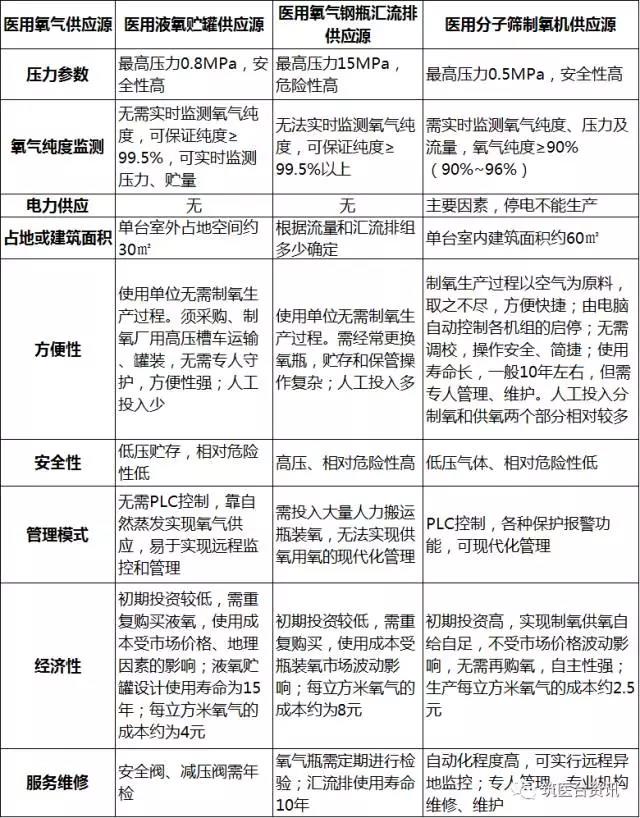 對(duì)比三種醫(yī)用氧氣源,醫(yī)用分子篩制氧機(jī)設(shè)備因其安全、方便快捷的供氧方式和便于管理的特點(diǎn),成為大中型醫(yī)院采用的主要氧源方式。
